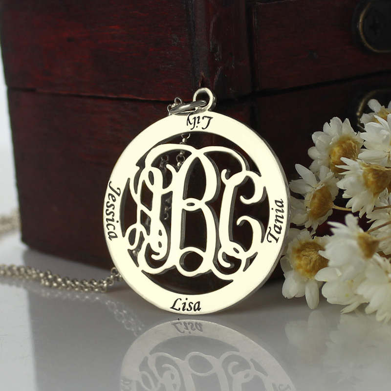 1. A monogram necklace is typically structured with the last name as the large initial in the center, first name initial on the left, and middle name initial on the right.