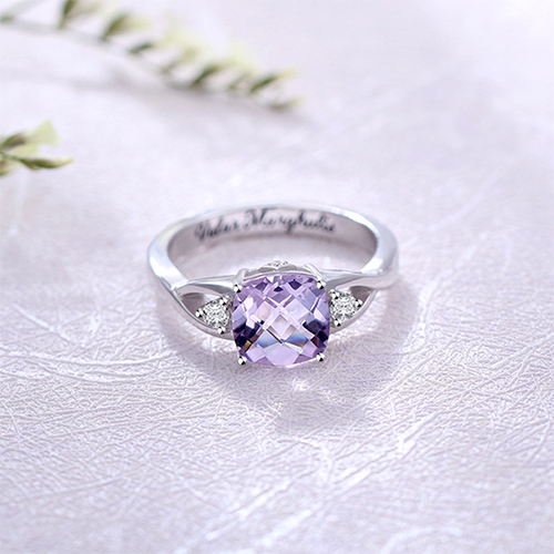 Featuring a lavish 8 mm millennium cut cubic zirconia stone, this shining ring is an eye-capturing masterpiece! The center stone is flanked on both sides by tiny CZs to accentuate its glimmer and elegance. Finely handcrafted of 925 sterling silver. This charming ring can be customized with any spcial words and short sentence up to 16 characters inside the ring band . You can also choice the birthstone color as your need, create a unusual gift for your loved one. Whether you are looking for an engagement ring or a special gift, this item is a great choice. It is available for ring sizes 6 through 10.