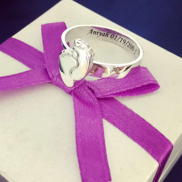 Engraved Baby Feet Ring For Mom Sterling Silver