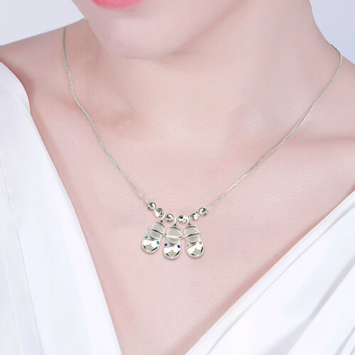 Whether newborn or all grown up, her children will always be her babies.Our adorable Baby Shoe Necklace commemorates this feeling with each child's name delicately engraved on the bottom of baby shoe and front engraved birthstone.Shoe symbolized bond between child and parent, It is one of kind gift for for mother or grandmother, each shoe represents a child.