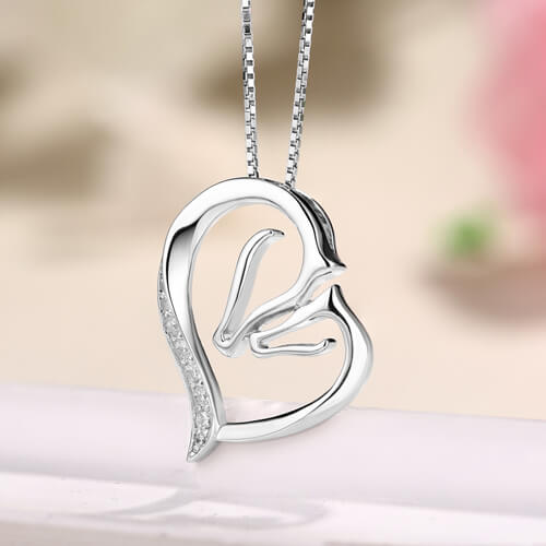Mom has held your hand through the good times and the bad. Express your love for her. There's nothing quite like a mother's love. Celebrate that special bond between mother and baby with this Mother horse and baby horse pendant. Fashioned in 925 sterling silver, this design features a mother horse Head to head her baby, symbolizing mother's deep love for kids. A line of shimmering Cubic Zirconia adorns the other. Sparkling of Cubic Zirconia and a bright polished shine, this pendant is a can be bought as a best gift for your dear mother. Tell your mother how special she is. Order now created a super surprise in mother's day!