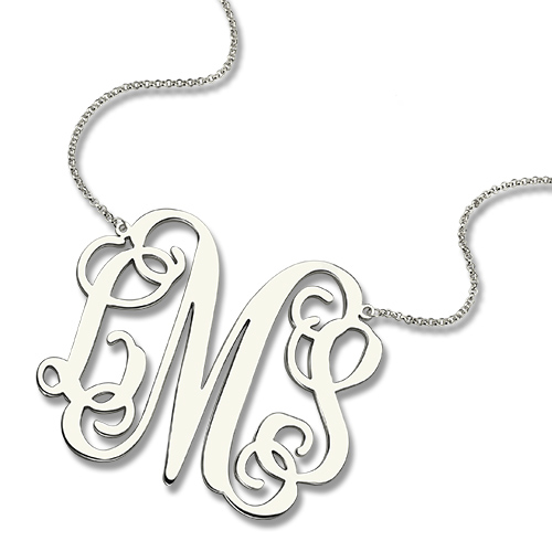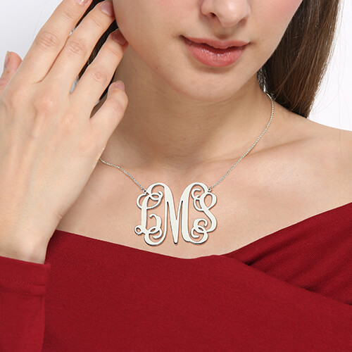 1. A monogram necklace is typically structured with the last name as the large initial in the center, first name initial on the left, and middle name initial on the right.