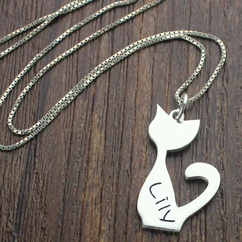 Personalized Cat Name Charm Necklace in Silver - The cat is one of most lovable pet that children like.Engraved the name you want to this tiny cat necklace ,make this item more stylish and personality.Especially for kids, this kitten necklace is a great choice! They will want to wear it all the time.