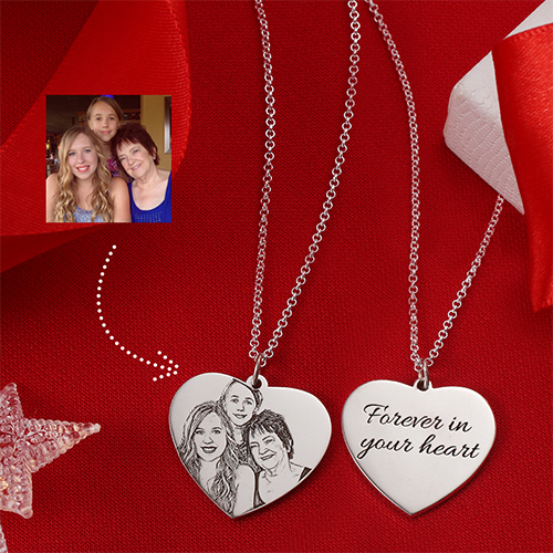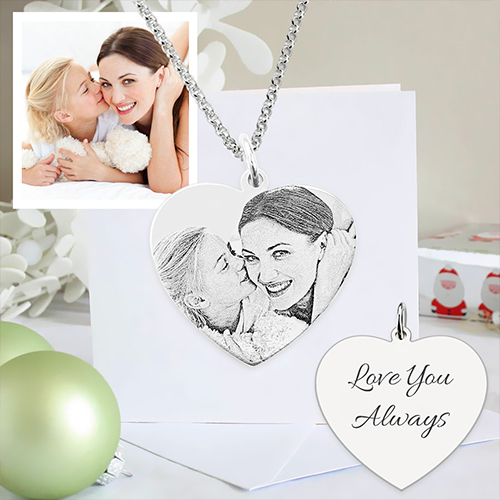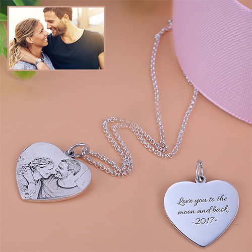 A photo captures a moment forever, and with our Heart-Shaped Engraved Photo Necklace, you can wear the photo every day. Personalize your heart charm with an engraved photo of your fondest memory and any words you want to express at the back of the pendant. Our delightful pendant comes on your choice of 14-22 inch silver rolo chain. It's a perfect gift full of sentimentality.