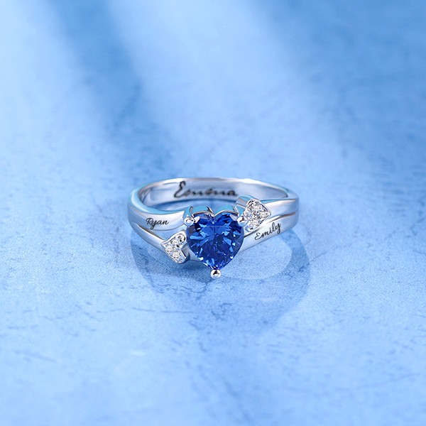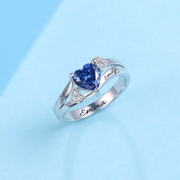 A personalized heart birthstone ring in gleaming silver culminates in a faceted heart shaped cubic zirconia stone for a stunning style she'll love. If you love hearts, birthstones, and high quality sterling material, you'll love our unique heart birthstone ring! Customize this ring with any colored birth month gemstone of your choice and personalized with your engraved names in it, this customized ring is a one-of-a-kind tribute to your forever bond!Celebrate the eternal nature of true love with this exclusive romantic jewelry gift.