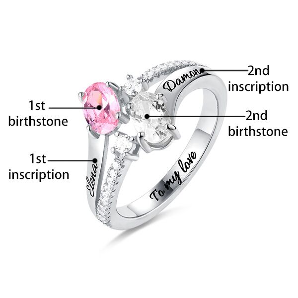 Elegantly handcrafted from 925 sterling silver in a fantastic design, this romantic ring features the two oval birthstones as the centerpiece, accented with two clear birthstones for added sparkle. In addition, you can choose to engraved some special characters on inner band and either side of the birthstones, which would be make the ring more unique.This exquisite personalized women’s ring is a truly wonderful gift!