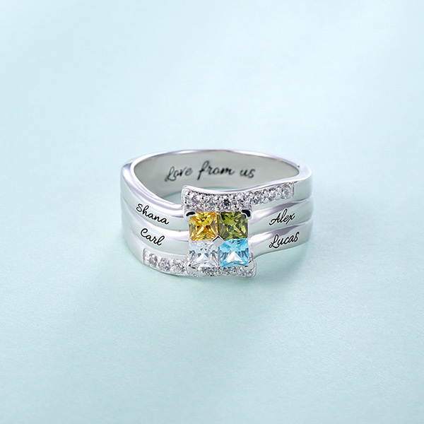 This Personalized Four Square Gemstone Ring is handcrafted of 925 sterling silver with a double curved row and set with four cubic zirconia birthstones. This ring celebrates the 'fours' and can symbolize the members of your family or four special friends. Selecting your favorite gemstones and customized with a meaningful message and metal color as a perfect gift to you loved one. . This engraved gift is perfect to celebrate an anniversary, Mother's Day, and many other special occasions.
