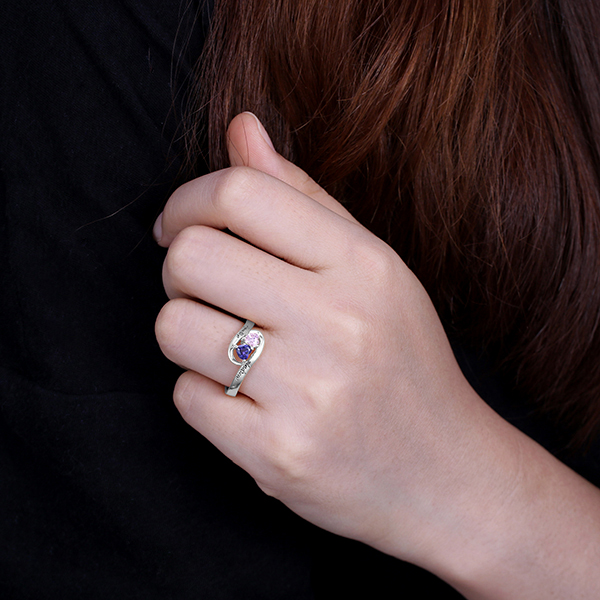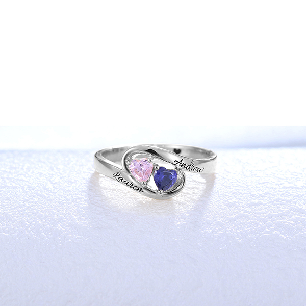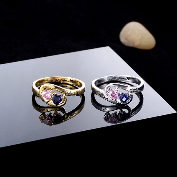 Show her true love and make this the perfect mother's, anniversary or promise ring gift. The top and bottom shanks cradle the stones to represent the protection, security and safety of your love. You can make this ring personalized with your choice of 2 birthstones, 2 names and a inner engraving. Please note names must be 8 characters or less and the inner ring engraving must be 20 characters or less. This ring truly a versatile and beautiful gift for any occasion.