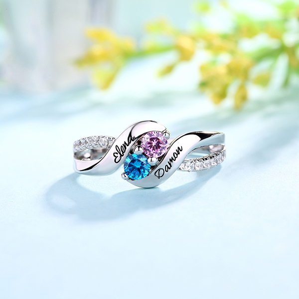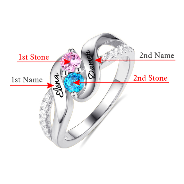 A stylish and meaningful addition to your jewelry box, our beautiful Double Birthstones Ring makes the perfect couple’s ring or family ring. Engraved with up to two names or meaningful words, it includes two sparkling stones in the colors of your choice. Made of gleaming sterling silver, it is also available in your choice of 18k rose gold plated sterling silver or 18k gold plated sterling silver .
