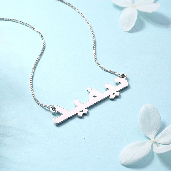 Drench yourself in striking Arab culture with this distinctive Arabic Name Necklace. The necklace is fully customized with your name in Arab Kanji symbols. This Arab necklace will distinguish you name from others. The ideal accessory for everyday wear, it makes a wonderful and meaningful gift for any occasion. Customize it with your name, the name of someone you love, or even an inspiring word(in AF_Al Ahsa font). This name necklace is the perfect precious and personalized present for a wife, girlfriend, sister and best friend.