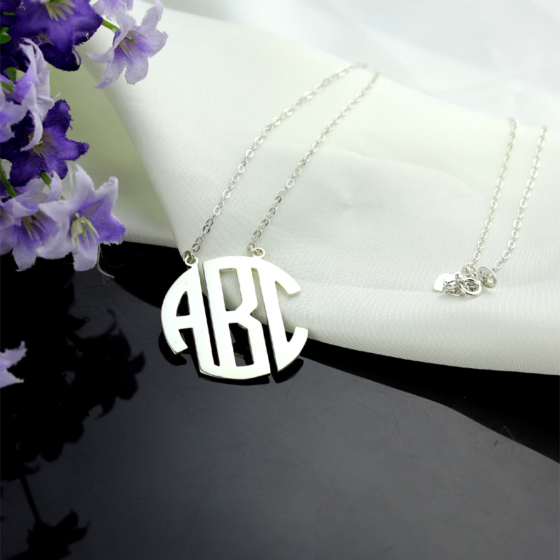 1. A monogram necklace is typically structured with the last name as the large initial in the center, first name initial on the left, and middle name initial on the right.