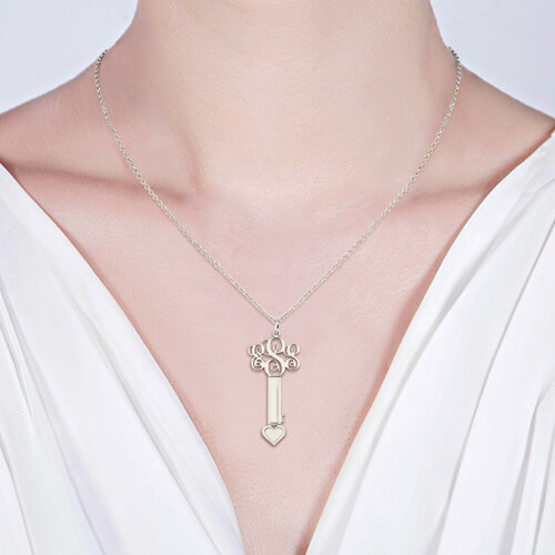 Personalize a silver monogram heart-shaped key necklace with the initials of your choice. This necklace is the perfect gift for a dear one to remind them of your love and thoughtfulness. Send the initials of your choice to place an order.